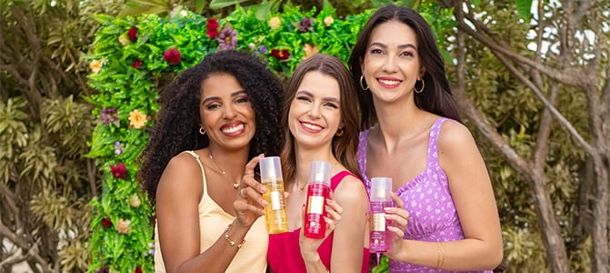 É uma linha de body splash com fragrâncias exclusivas, pensada para perfumar o corpo e cabelo com leveza e alta fixação no dia a dia.